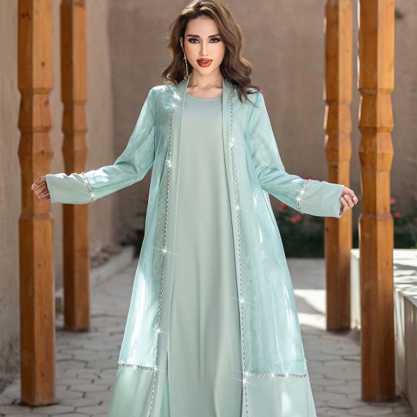 This flowing mint-green abaya is designed for the woman who values effortless charm and elevated style. The delicate wave-like drapes create a soft, ethereal silhouette, making it perfect for both everyday wear and special occasions.