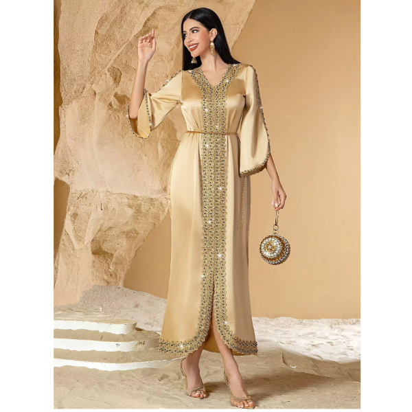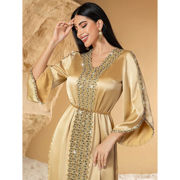 Crafted with flowing lightweight fabric, this abaya-inspired dress offers a modest yet fashion-forward silhouette that moves with grace. The soft, breathable texture ensures all-day comfort, while the subtle golden undertones add a touch of luxury and refinement to your wardrobe.
