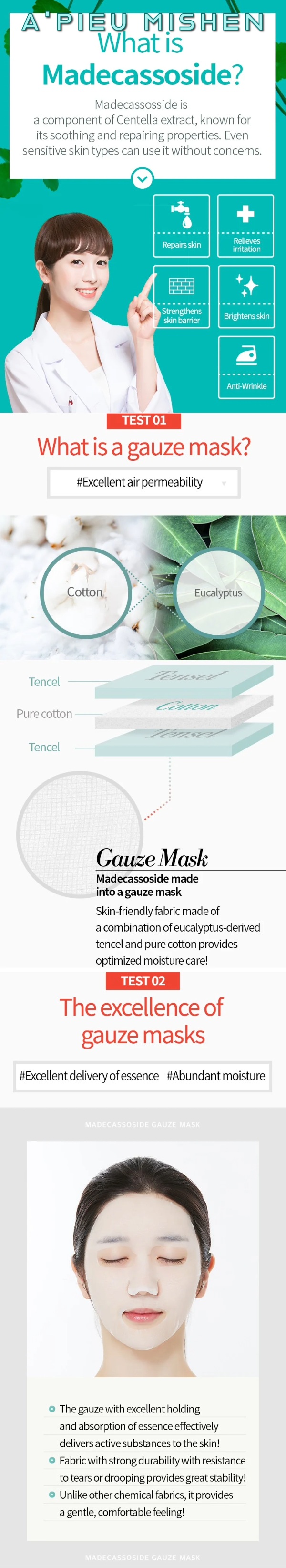 A’PIEU MADECASSOSIDE Gauze Mask - Provides deep, nourishing moisture to care for dry and sensitive skin. The skin-friendly Tencel fabric enhances absorption, delivering hydration effectively. Infused with Madecassoside, it soothes, calms, and restores moisture balance for a healthier, more comfortable complexion.