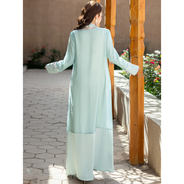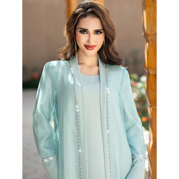 This flowing mint-green abaya is designed for the woman who values effortless charm and elevated style. The delicate wave-like drapes create a soft, ethereal silhouette, making it perfect for both everyday wear and special occasions.