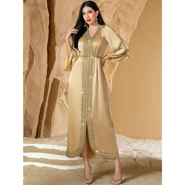 Crafted with flowing lightweight fabric, this abaya-inspired dress offers a modest yet fashion-forward silhouette that moves with grace. The soft, breathable texture ensures all-day comfort, while the subtle golden undertones add a touch of luxury and refinement to your wardrobe.