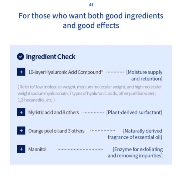 Water, Glycerin, Myristic Acid, Stearic Acid, Lauric Acid, Potassium Hydroxide, Palmitic Acid, Potassium Cocoyl Glycinate, Coco-Glucoside, Glyceryl Stearate, Acrylates/C10-30 Alkyl Acrylate Crosspolymer, Citrus Aurantium Dulcis (Orange) Peel Oil, Sodium Cocoyl Isethionate, Lavandula Angustifolia (Lavender) Oil, Arachidic Acid, Disodium EDTA, Pinus Sylvestris Leaf Oil, 1,2-Hexanediol, Oleic Acid, Quillaja Saponaria Bark Extract, Propanediol, Citric Acid, Mannitol, Sodium Hyaluronate, Benzyl Glycol, Hydrolyzed Glycosaminoglycans, Hydroxypropyltrimonium Hyaluronate, Sodium Hyaluronate Crosspolymer, Hydrolyzed Hyaluronic Acid, Ethylhexylglycerin, Sodium Acetylated Hyaluronate, Hyaluronic Acid, Hydrolyzed Sodium Hyaluronate, Potassium Hyaluronate